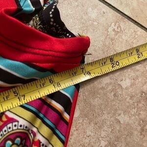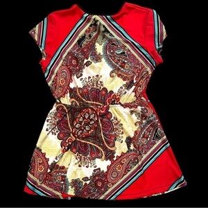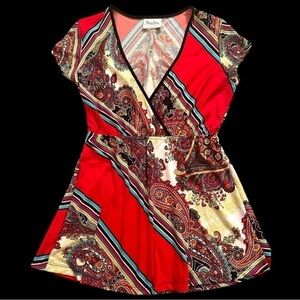 Multi colored top cross in front surprisingly covers you without having to pin together (34DD). Cap sleeves light weight and comfortable.