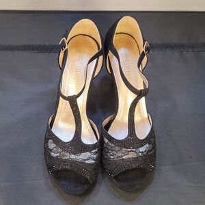 DREAM PAIRS WOMEN'S FASHION STILETTOS OPEN TOE PUMP HEEL SANDAL SIZE 7.5 COLOR BLACK Sole material Leather, Synthetic Rubber, Rubber Outer material Rubber Closure type Buckle Heel measures approximately 3 inches Platform height: 0.25 inches (Approx)TPR rubber out-sole Finished with a slightly padded faux leather insole Give any dress an elegant look with these adorable high heels! Featuring shining rhinestones upper with metallic leatherette upper, crossed strap design with adjustable buckle closure, open toe, platform, stiletto heel, and lightly padded insole. THIS ITEMS IS PRE-OWNED EXCELLENT CONDITION WITH ONLY LIGHT SIGNS OF WEAR IF ANY CHECK THE PICTURES
