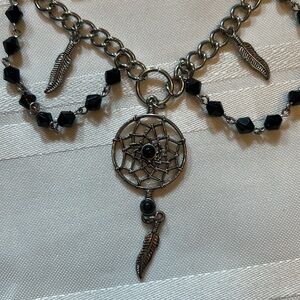 Silver tone fashion jewelry choker w/black beading and 3 feathers adorning the dreamcatcher. Lobster closure w/a 2” extender. Feel free to make a reasonable offer 👍