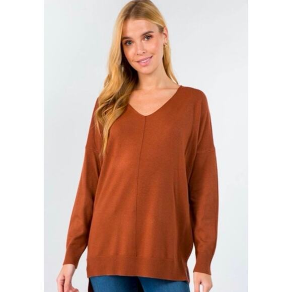Loose fit soft v-neck sweater cotton-blend knit with front seam detail.
