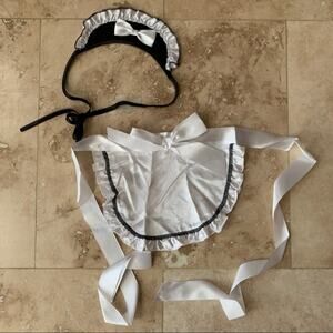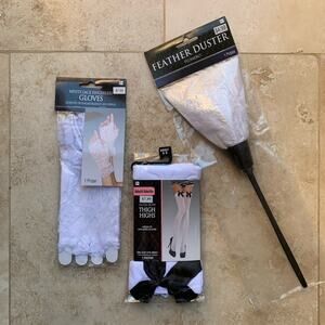 includes ruffled headpiece, apron, gloves, stockings (white with black bows) and feather duster