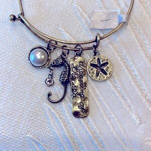 New Dreaming of the Sea bangle bracelet. Charms included are pearl, seahorse, dreaming of the sea charm, and starfish.