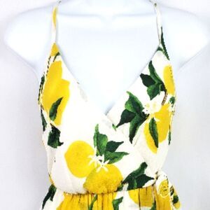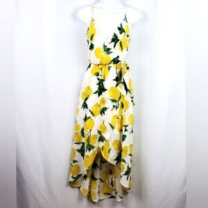 Dream of Me Lemon Print Faux Wrap High Low Dress SMALL In excellent condition Spaghetti straps Crossover front bodice Faux wrap styling skirt With self tie belt on one side of waist Cinched & Elasticized waistline Lined with shorter skirt under High low hemline Size SMALL