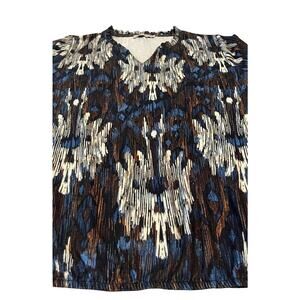 DREAMSTAR LONG SLEEVE V-NECK TOP, WOMENS, XL, NAVY BLUE BROWN WHITE ABSTRACT