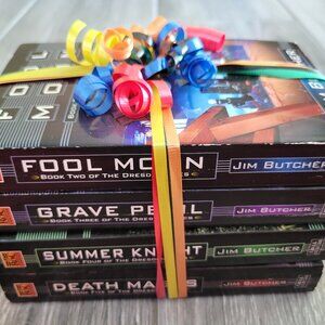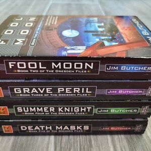 DRESDEN FILES BOOKS SET LOT OF 4 #2-5 BY JIM BUTCHER VINTAGE COVER ART FROM THE EARLY 2000s, very good clean condition from a smoke-free home. Books included: #2 Fool Moon, #3 Grave Peril, #4 Summer Knight, #5 Death Masks. These are older copies w/vintage cover art from the early 2000s. They would make an excellent addition to your Jim Butcher book collection.