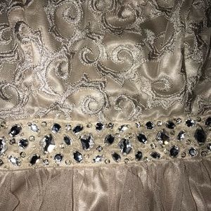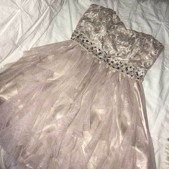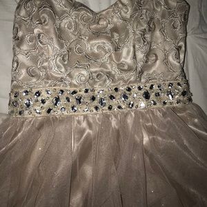 THIS IS A NUDE DRESS WITH SOME SPARKLES PERFECT FOR A WEDDING, PROM, GRADUATION, ETC. IT HAS TULLE AT THE BOTTOM AND IT IS STRAPLESS! BRAND NEW, HAD NO TAGS BECAUSE I TEND TO ALWAYS RIP THEM OFF AND HANG THINGS IN MY CLOSET.