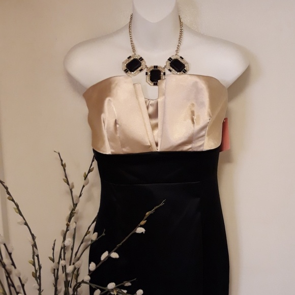Black & Champagne Colored cocktail dress. Top half Satin , bottom half Polyester Spandex. Runs Small