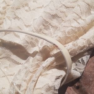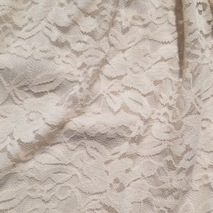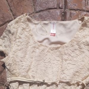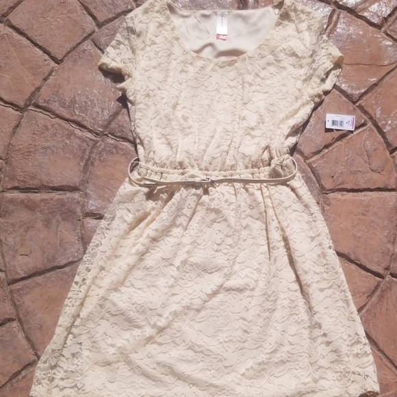 Tan lace dress with elastic band around waist, comes with a detachable belt. Dress has scoop neckline and short sleeves. The belt has a small nick in it as shown in the picture above
