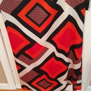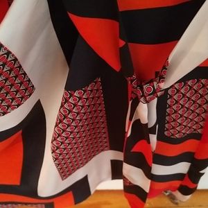 Red white and blue dress, drapped at waist with tie, lining( had to cut a little because it kept showing under dress) not noticeable,short sleeves.