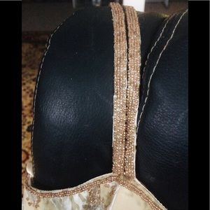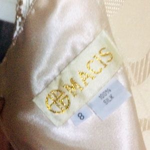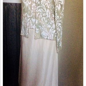 Beautiful evening dress ,can be mother of the bride, A-line 2pieces gown,concealed back zipper. Hit at floor. Center back approx 53”,bust36,5”waist30”, hip 40” 100% silk, lined. Top is sheer olive silver with all over hand beaded embellishment. Front waist down beige. In excellent condition wear only one time