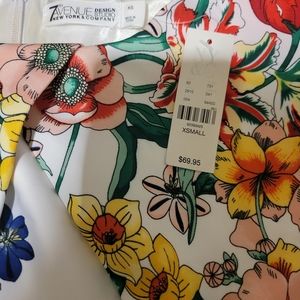 White sleeveless dress with blue, yellow, pink, and red flowers on front and back with a small split in the back