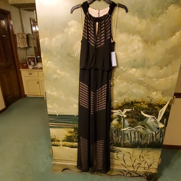 LONDON TIMES KEY HOLE MAXI W/ SHADOW STRIPED INSETS. BNWT NEVER WORN. COLOR BLACK SIZE 10. HALTER TYPE W/ KEYHOLE IN FRONT & BACK. SLIP ON DRESS NO ZIPPER IN BACK.