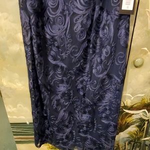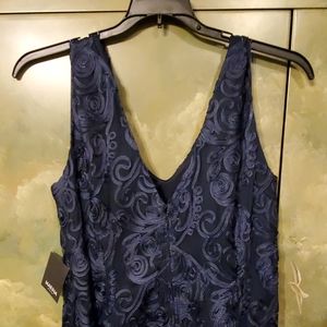 PLUS V NECK SOUTACHE DRESS BY MARINA DRESSES BNWT NEVER WORN. SIZE 20W, COLOR NAVY WITH NAVY EMBROIDERED DESIGNS. SLEEVELESS ZIP DOWN BACK & FALLS BELOW KNEES(5FT6)