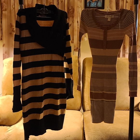Stripe and stretchable. 2 dresses one if fleece other fabric of the dress reallt stretch. 1 dress is stripe of brown and black. 2nd dress is stripe multiple colors