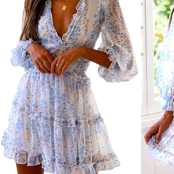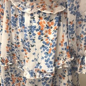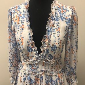 Floral print ruffled long sleeve mini dress. Deep V- fitted waist- cut out in back. Small. 34” length.