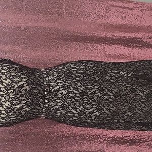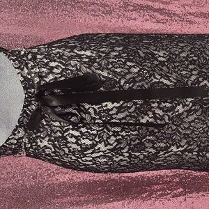 long formal blk lace with white lining. Mid blackout with a waist belt trimmed with rhinestones long to ankles 5'4 or better