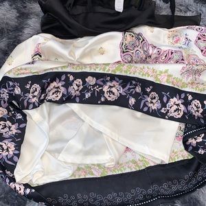 This dress is so pretty in person. The top is black in a shinier material & you can tie it as tight as you want to slim your waist. It’s a silky material & even has a slip underneath so it is not see through. It zips on the top of the back. I never got to wear it before outgrowing it. My loss is your gain.