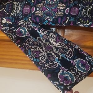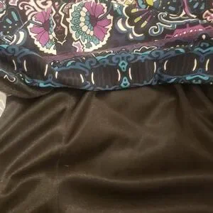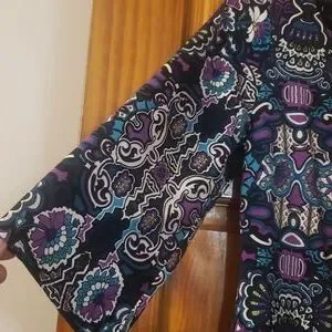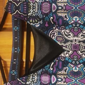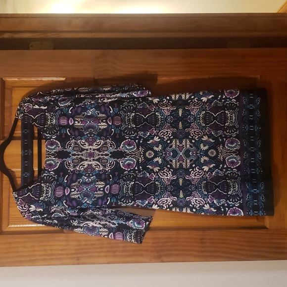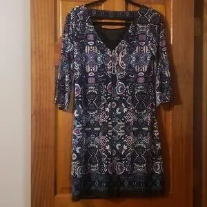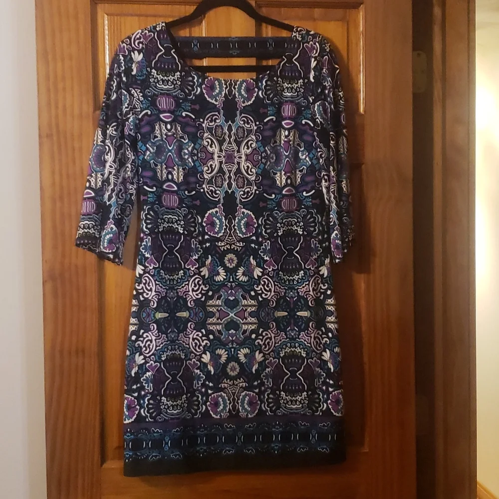 Lovely navy background with purples, teal and ivory - comfortable, lined dress with cute back.