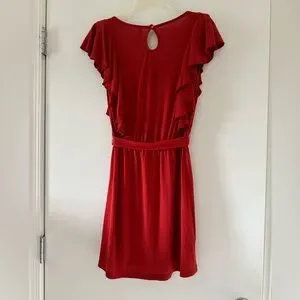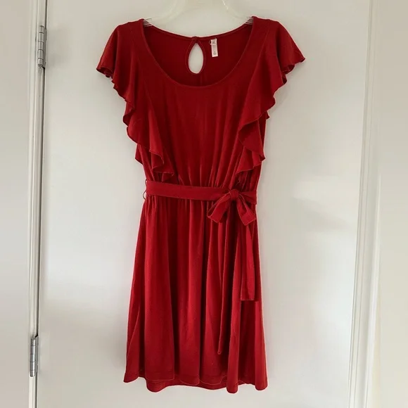 Deep Red knit dress with belt. Knee length.