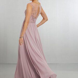 Dusty Rose bridesmaid dress features a metallic embroidered bodice, with mini cap sleeves extending from the V-neckline and the keyhole illusion back. A fully gathered skirt completes this flattering A-line gown.