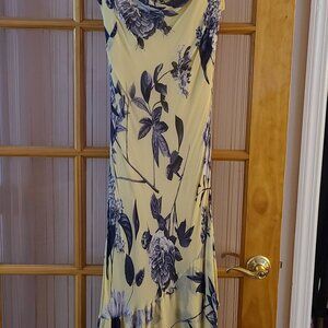 Yellow with blue accents, beading detail, cowl neck, and complimentary earrings.