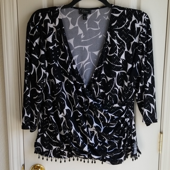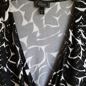 DRESS BARN COLLECTION black and white peplum style sequined evening wear blouse. Beaded at hemline. Great blouse for festive holiday events! Fabric is polyester/spandex blend.