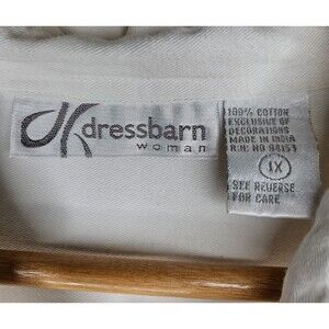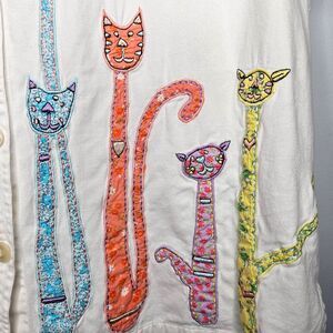 DRESS BARN Vintage Shirt. Women's 1X. White. Multicolor Applique Cats. Short Sleeves. Button Up. 100% Cotton. There are two small stains on the front (see photos 4 and 5). One stain cannot be seen when buttoned up. The other stain is visible when shirt is buttoned. Chest approximately 24 inches pit to pit. Length approximately 20 inches.