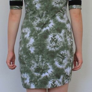 Knee-length slim-fit dress. V-neck. Green tie-dye with black bands around sleeves and neckline. Please only bundle--2 for $18 or 4 for $30.