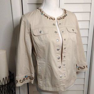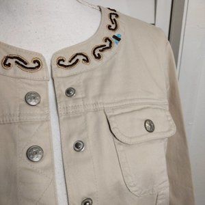 Dress Barn khaki jacket. Snap close. Brown & turquoise beaded accent. 2 front pockets. Mint condition with no defects.
