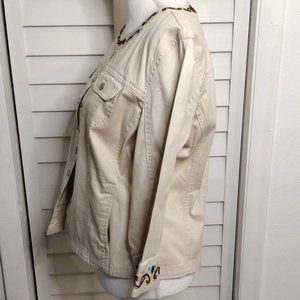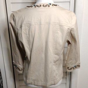 DRESS Barn beaded accent khaki cotton/spandex jacket. Snap close. Sz. L