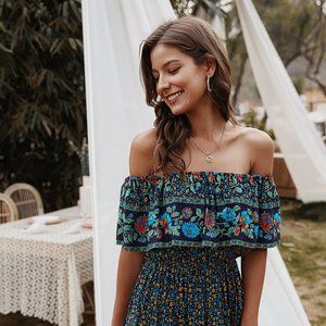 DRESS Floral Print Off Shoulder Ruffled Dress Navy