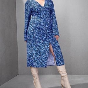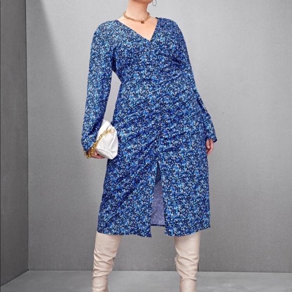 DITSY FLORAL RUCHED FRONT SLIT HEM DRESS
