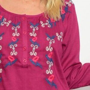 Perfect for the season this fuchsia mini dress features lovely embroidery, a button up detail at neckline, long sleeves with embroidered details and a chic fit. Pair with heels and a pair of statement earrings