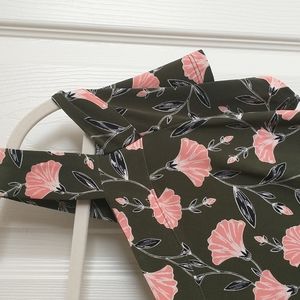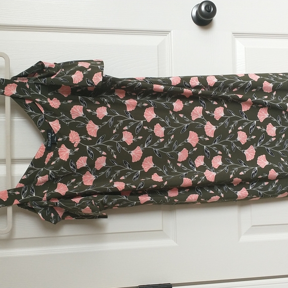 cold shoulder style dress. love olive greenish with peach flowers. NWOT. never worn. too of knee length. great summer dress. or year-round with blazer or sweater.