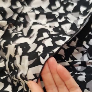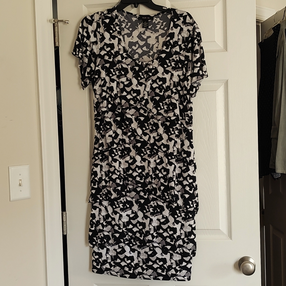 Macy's Style and Co. black white gray polyester dress with asymmetrical layers for flattering no belly look. sits at bottom of knee I'm 5'4". mint condition.