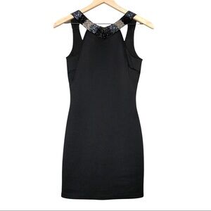 Thick stretch fabric bodycon special occasion little black dress (LBD). Graphic navy blue, black, and silver beading around the neckline. Sleeveless. Low open back with invisible zipper closure. Good condition with very minor snags near the hemline (pictured). 90% Polyester 10% Spandex. Approximate measurements: 30” bust, 32” long. Women’s size small.