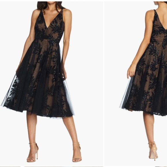 DRESS THE POPULATION COURTNEY SEQUIN LACE BLACK/NUDE COCKTAIL MIDI DRESS sz S