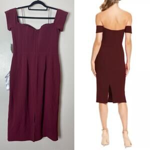 DRESS THE POPULATION BODYCON OFF THE SHOULDER DRESS L BURGUNDY RED BAILEY MIDI SHORT KNEE TEA LENGTH COCKTAIL WORK PARTY HOLIDAYs CHRISTMAS FESTIVE ROMANTIC