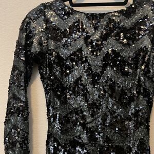 Black and dark grey sequins add liquid shine to a short, stand-out dress with light-catching appeal and a memorable open back.