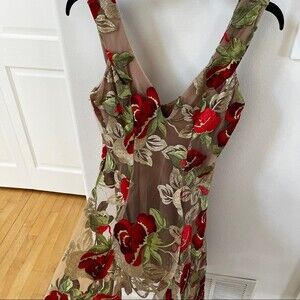 An airy mesh overlay gives this sleekly flared dress its great twirl. Radiant, colorful flowers embroidered throughout set a luxurious tone.