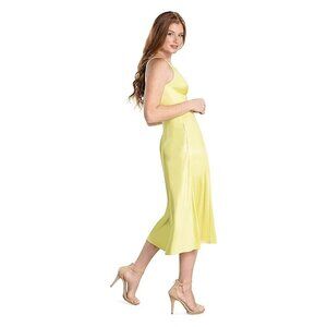 DRESS THE POPULATION NWT $180 Serafina Fit & Flare Midi Dress in Lemongrass Stretch Slit Sleeveless Pockets Lined