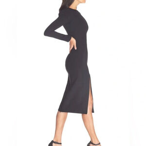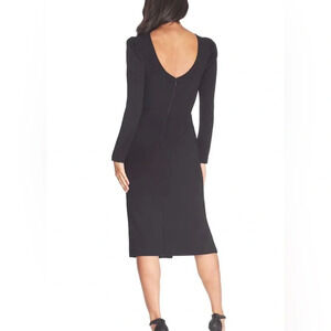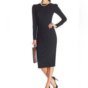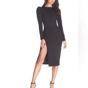 Featuring a high round neckline, long sleeves that puff at the shoulder, and a form fitting silhouette. With a front slit, and back slit detail that zip and unzip to your preferred length. Perfectly styled for modest to modern occasions.
