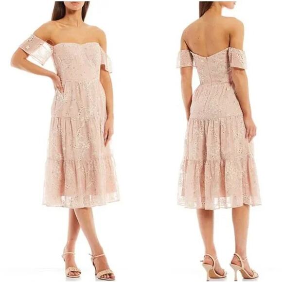 DRESS THE POPULATION River Dress Small Pink Lace Off Shoulder Fit Flare Midi NWT
