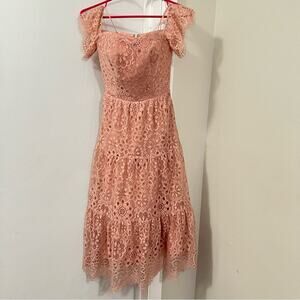 Add undeniable charm to cocktail hour in this lace-lilted dress, decked with a ruffled skirt and tailored to sweetly show off your shoulders.