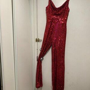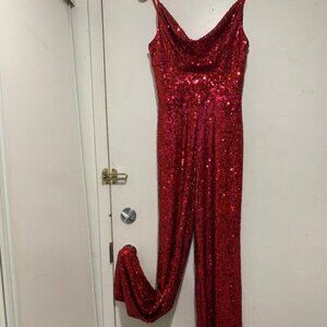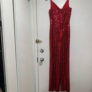 Dress the Population Sequin Jumpsuit, Size S, Color Red, Sequins, 95% Polyester, 5% Spandex, Lined, Adjustable Sleeveless Strap, Closure Back Zipper, Hook, Pant Bottom Small Patch of the Sequin Silver, in Good Condition, Relaxed Fit, Great Look, Great Fit.