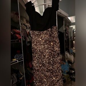 A mix of sleek off-the-shoulder style and sequined shimmer levels up the glam factor of this bodycon number from Dress the Population.