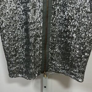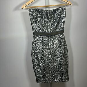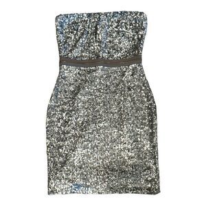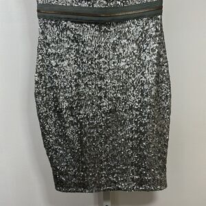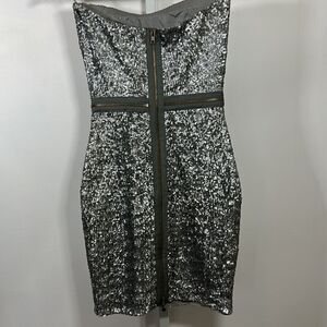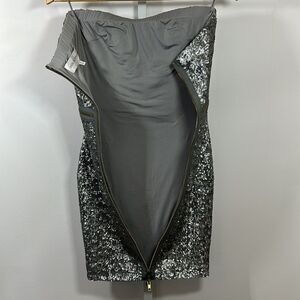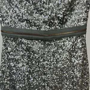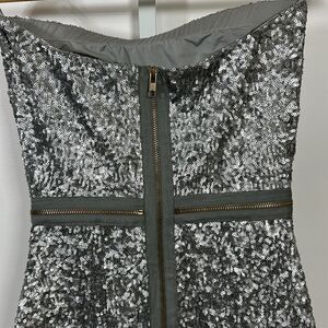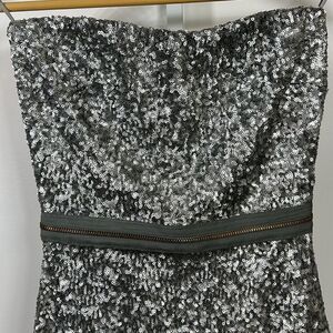 Stunning. Strapless with elasticized neckline. Back exposed dual gold toned zip closure with gray canvas trim. Exposed gold toned zipper trim at waistline with gray canvas trim. Silver sequins throughout. Fitted. Stretch material. Mini. Lined. Special occasion. Party. Girls’ night out. Cruise. Vacation. Date night.