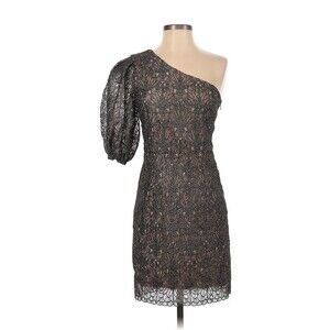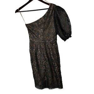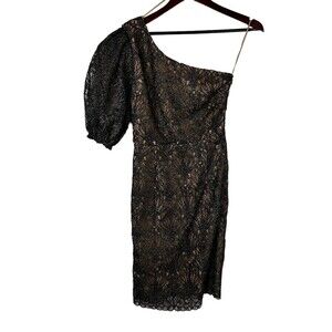 J216 DRESS THE POPULATION size XS One Shoulder Cocktail Dress black shimmer & beige. Zip closure Puff sleeve Excellent condition