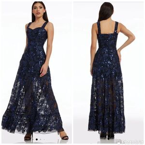 New with tags , The sophisticated Anabel features a sweetheart neckline atop a fit and flare gown. A sequin embroidery in Navy adds flare to this stunning gown.