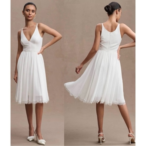 This versatile Dress the Population Alicia Dress is a midi A-line silhouette that features a v-neckline, fitted crepe bodice, softly gathered chiffon skirt, and scalloped lace hem for a romantic finish.